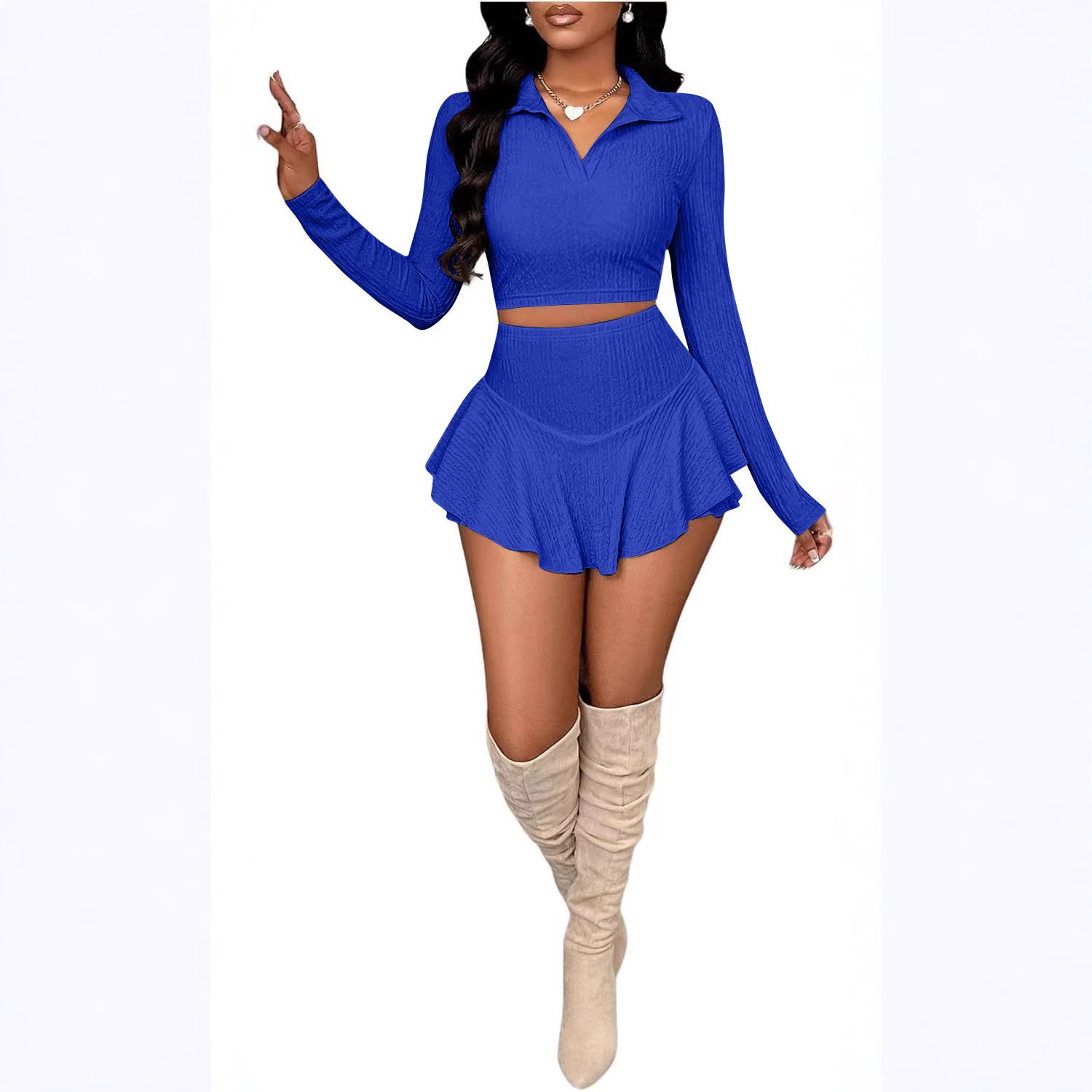 Product Description Turn heads with this Fashion Solid Colour Short Navel Ruffled Pearl Skirt Suit, a stunning two-piece set that blends elegance, femininity, and modern charm. The short ruffled top accentuates your waistline with a flattering cropped cut, while the pearl-embellished skirt adds a touch of sophisticat