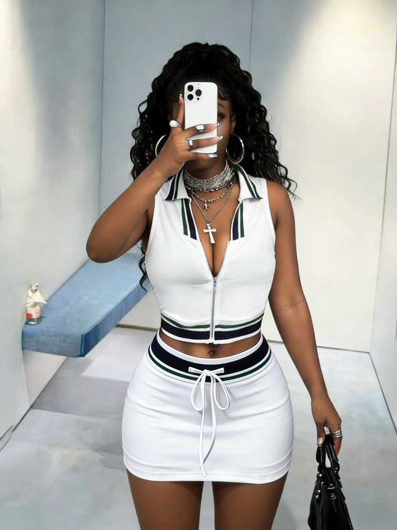 The sleeveless sporty-collar crop top creates a clean, modern silhouette, while the high-waisted mini skirt with an adjustable tie waist enhances your shape and adds a playful touch. Crafted from soft and breathable fabric, this outfit ensures comfort throughout the day.