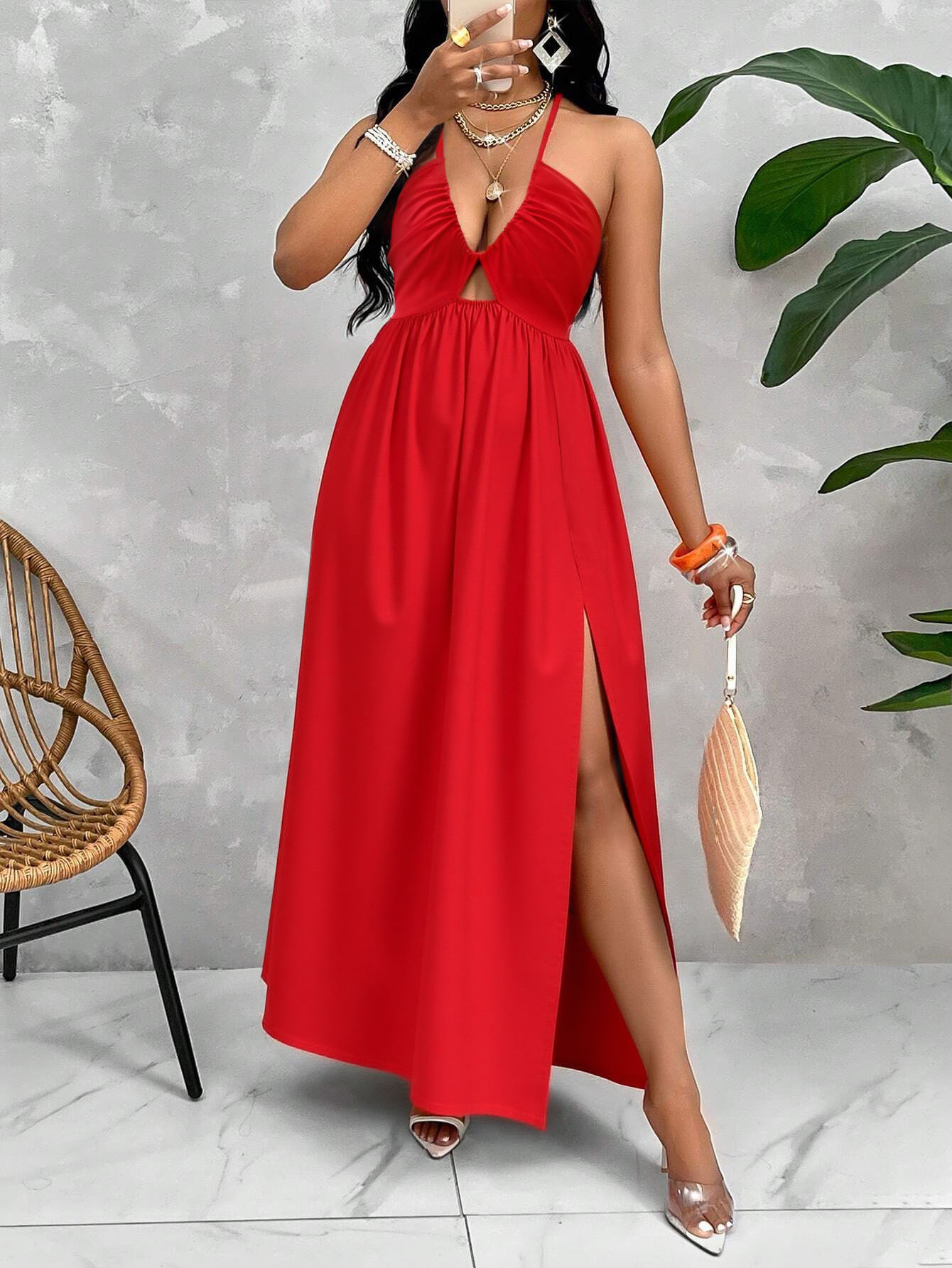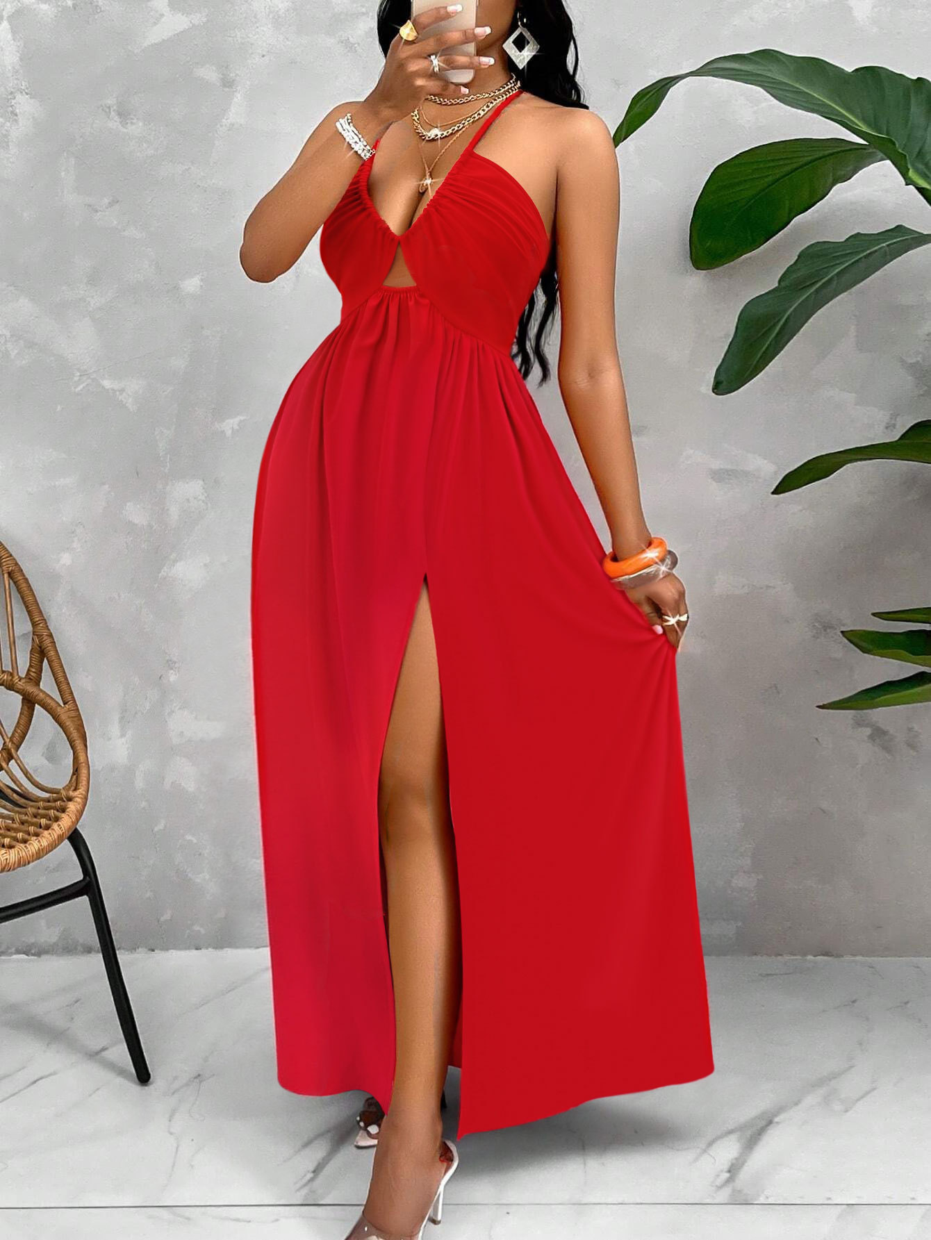 Product Description Turn heads effortlessly in this Deep V-Neck Drawstring Halter Dress, designed to highlight your curves with a bold, elegant touch. The striking deep V-neckline enhances your silhouette, while the halter-neck design adds a chic, modern feel. Featuring an adjustable drawstring, this dress lets you cus