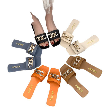 Step into style and comfort with our exceptional Flat Slippers with Black Metal Link. Designed to elevate your casual look, these slippers are the perfect blend of fashion and functionality.