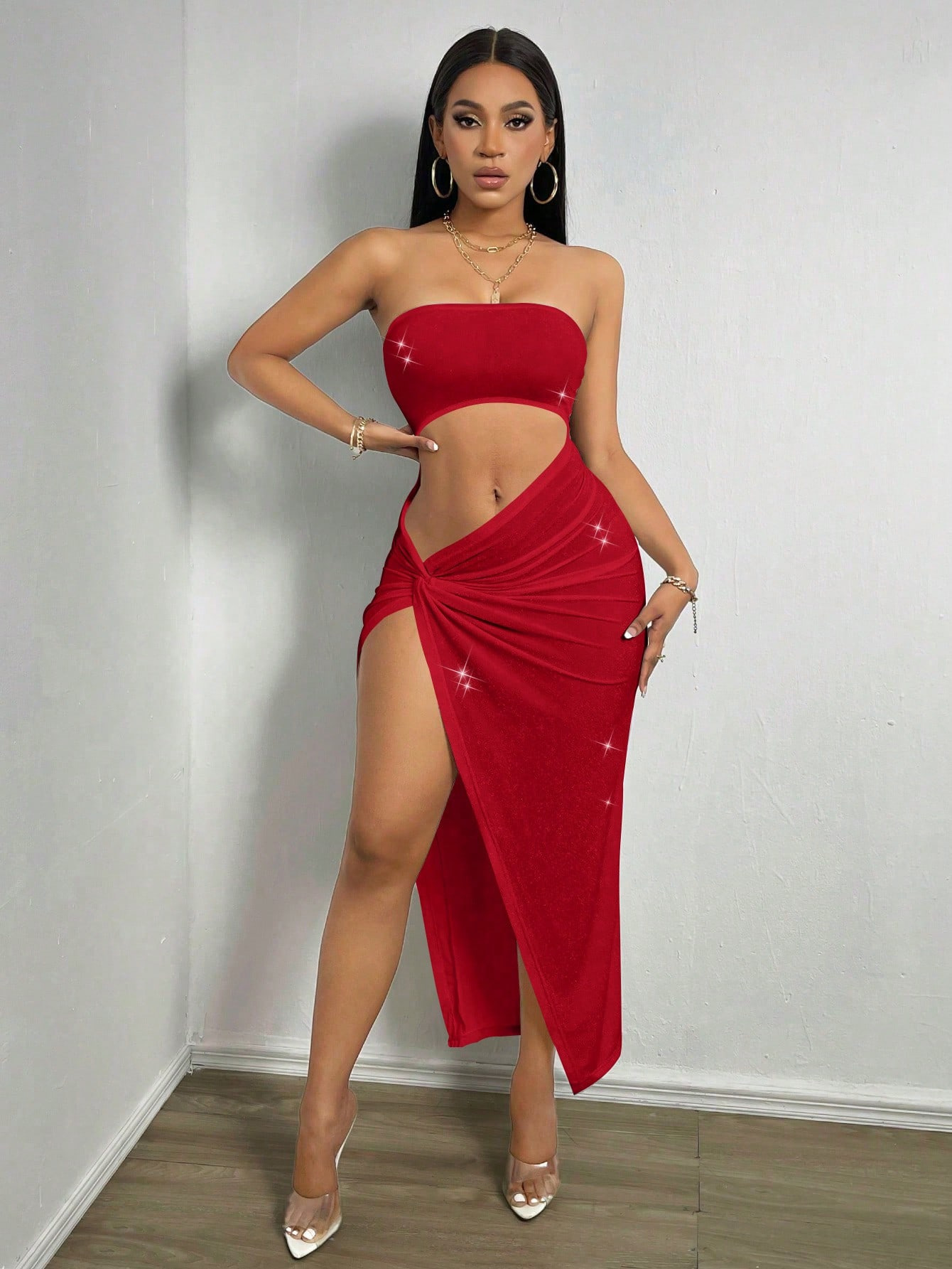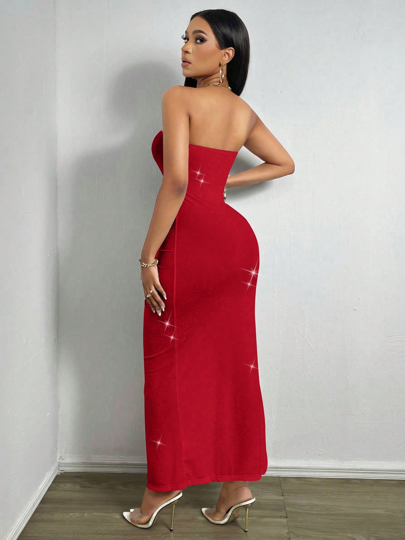 Sexy Hollow-Out Strapless Slit Bodycon Maxi Dress