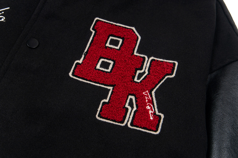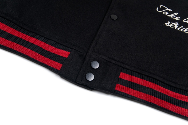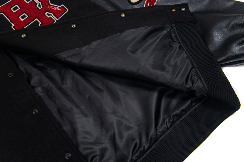 Classic varsity/flight jacket details: ribbed hem, cuffs, and collar