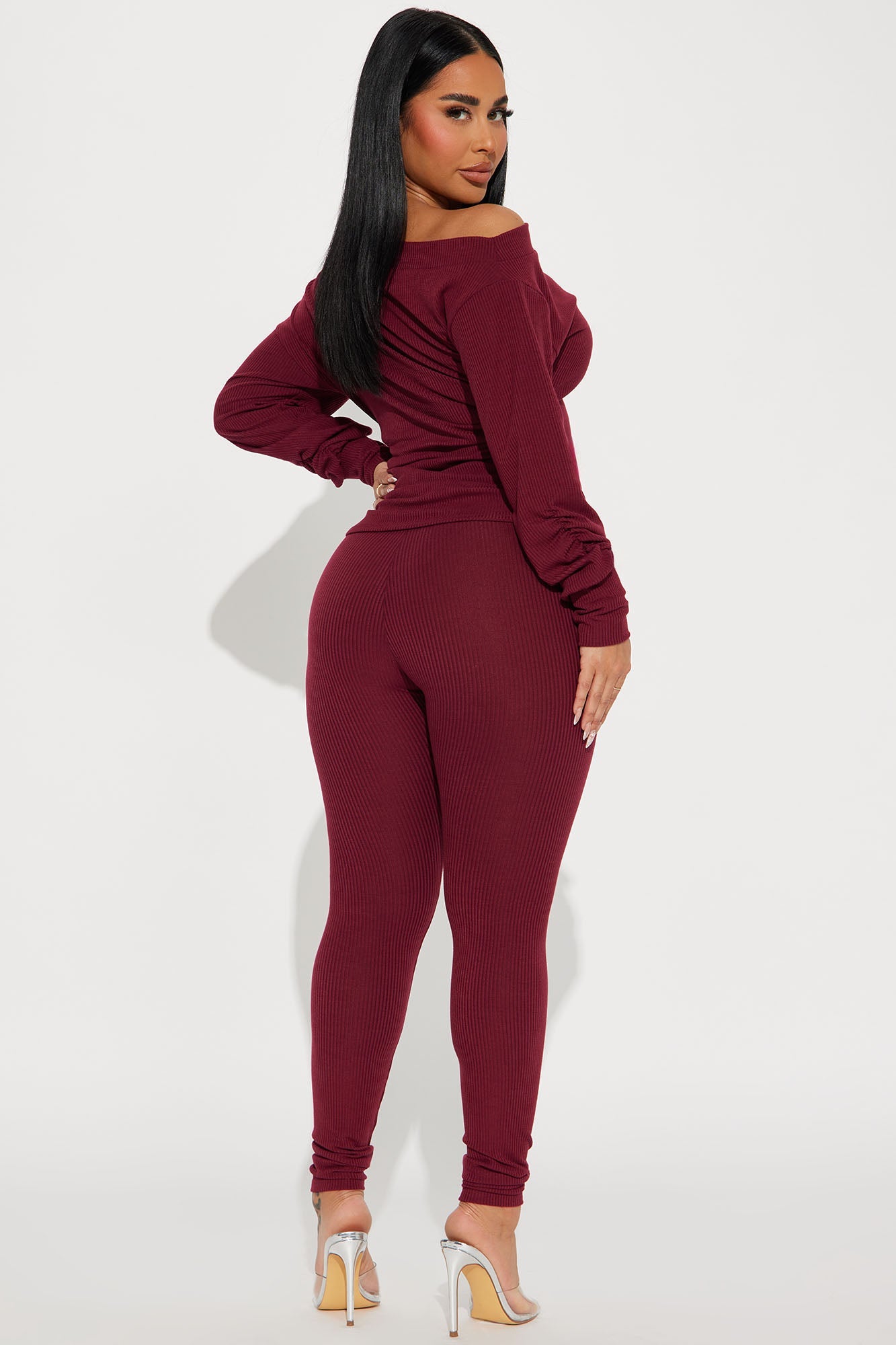 Available In Charcoal And Burgundy. Ribbed Pant Set Off Shoulder Ruched Detail Legging Elastic Waistband Stretch 82% Polyester 10% Rayon 8% Spandex Imported
